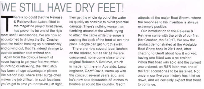 I fitted a great locally designed gadget to the front of my boat and about 200 launches down the track I can report that it’s one of the best investments I ever made. The patented Release and Retrieve Boat Latch is by far the cleverest device of its kind. Constructed from high-quality marine-grade stainless steel, it is designed to eliminate most of the problems associated with drive-drive off trailers.