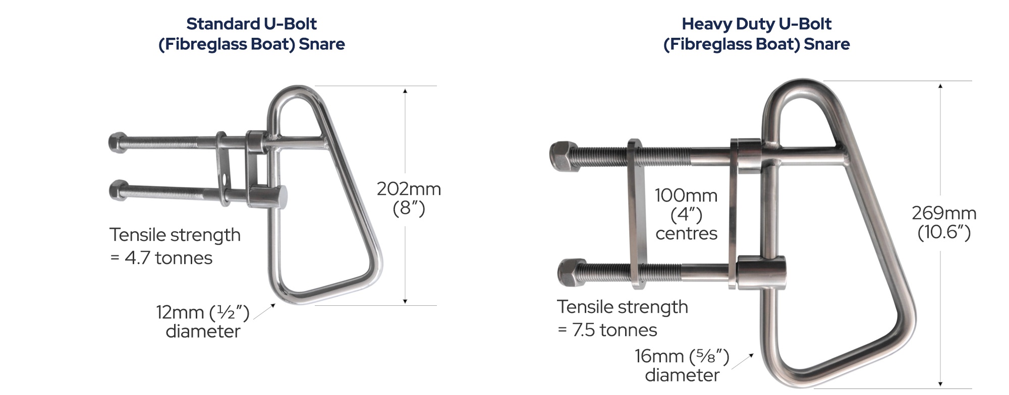 The L & R Fibreglass U-Bolt Snare is made from marine grade 316 stainless steel which makes it durable and robust in all marine conditions. And with the choice of standard or heavy duty, you can get precisely what you need for your boat!